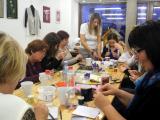 S čipkami za ozadje so se udeleženke rokodelske delavnice izdelave kvačkanega nakita (petek, 21.3.2014) učile izdelave nakita iz žice. Tudi tokrat pod vodstvom rokodelke Maje Dolinar Dubokovič.