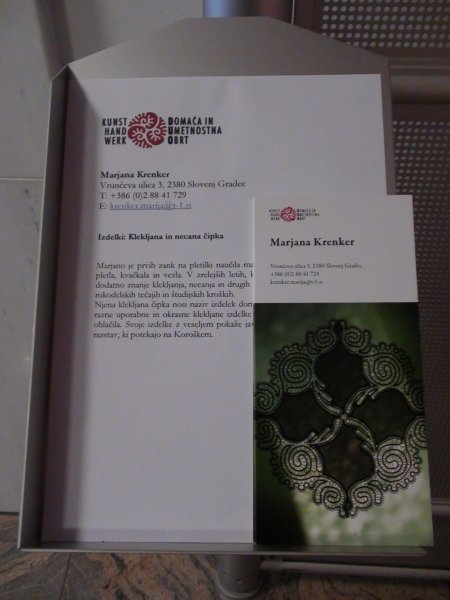 V galerijskem delu atrija NLB d. d. na Glavnem trgu 30 v Slovenj Gradcu si lahko od 7. do 20. avgusta 2012 ogledate razstavo izdelkov iz klekljane in necane čipke (nakit, prtički, slike) domačinke Marjane Krenker. Njeni izdelki imajo certifikat rokodelstvo art&craft Slovenija.