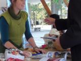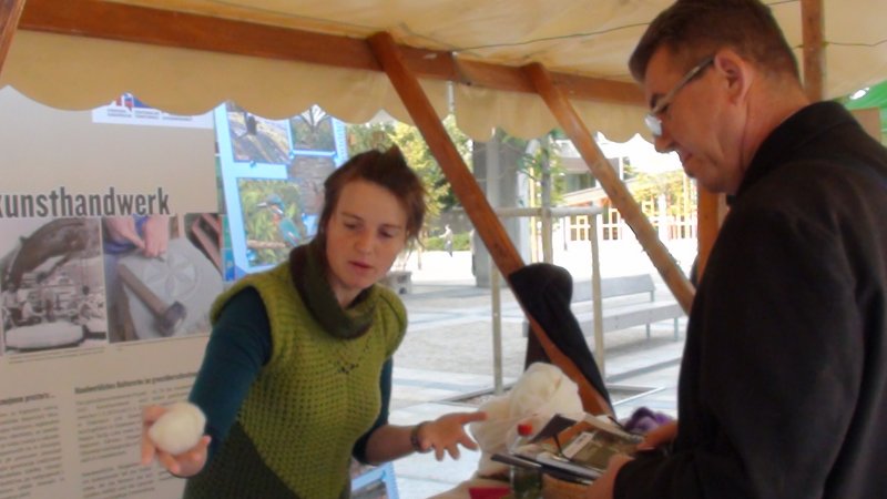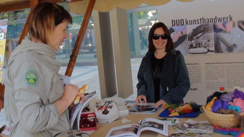 Številni obiskovalci so bili navdušeni nad predstavitvijo rokodelskih izdelkov koroških rokodelcev in prikazom tehnike suhega polstenja. Na predstavitvi sva bili Katarina Žagar (Podjetniški center Slovenj Gradec) in Katka Žbogar (Razvojna agencija SORA).
