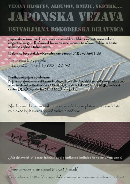 Z mentorico rokodelko Ano Vidic smo se že večkrat posvetili ročni vezavi papirja in ročni izdelavi knjižic, blokcev in notesnikov... Tudi tokrat bo tako, v petek, 28.3.2014, v Rokodelskem centru DUO Škofja Loka pripravljamo rokodelsko delavnico ročne vezave papirja v tehnikah japonske vezave.