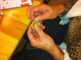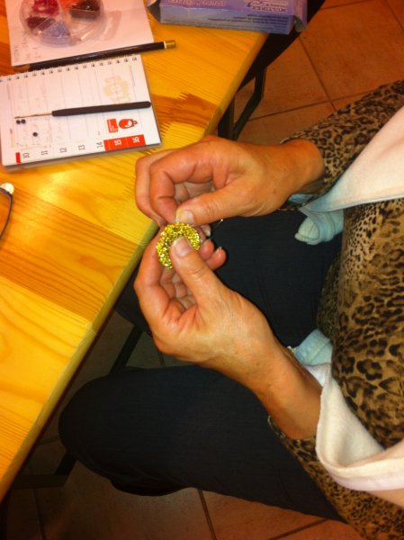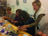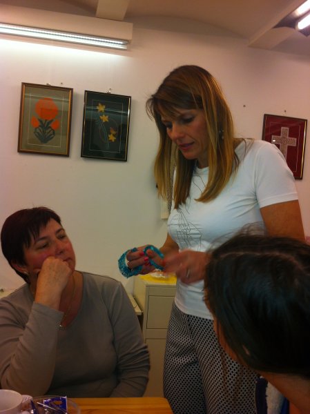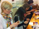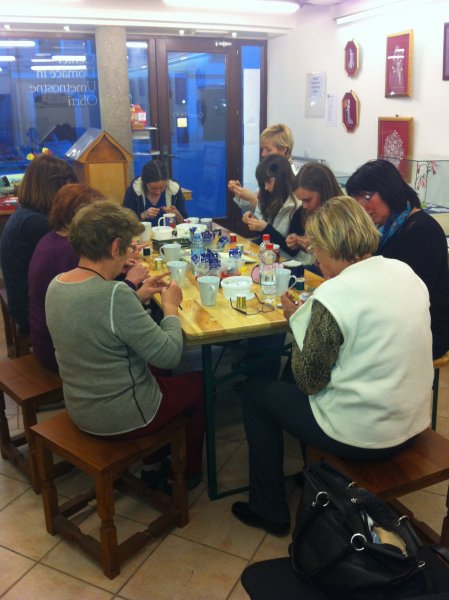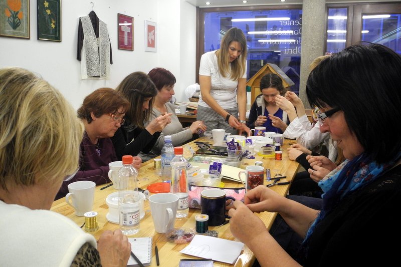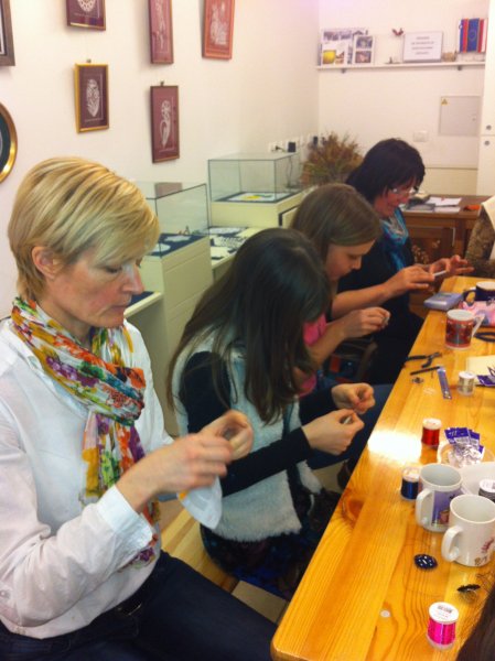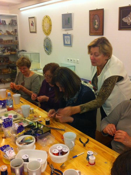 S čipkami za ozadje so se udeleženke rokodelske delavnice izdelave kvačkanega nakita (petek, 21.3.2014) učile izdelave nakita iz žice. Tudi tokrat pod vodstvom rokodelke Maje Dolinar Dubokovič.