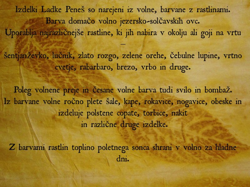 Izdelki Ladke Peneš so narejeni iz volne, barvane z rastlinami. Barva domačo volno jezersko-solčavskih ovc. Uporablja najrazličnejše rastline, ki jih nabira v okolju ali goji na vrtu – šentjanževko, lučnik, zlato rozgo, zelene orehe, čebulne lupine, vrtno cvetje, rabarbaro, brezo, vrbo in druge.