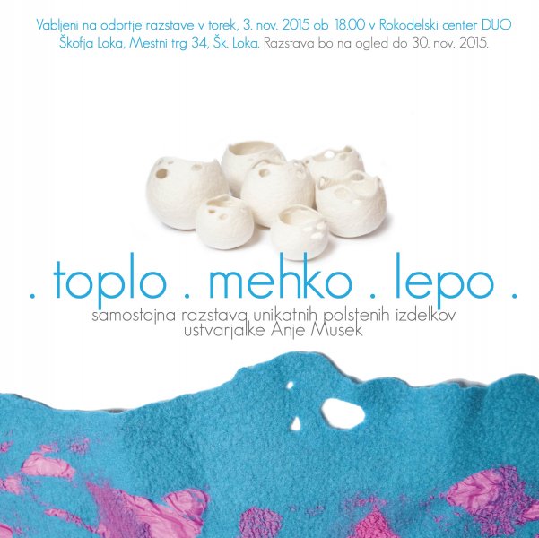 Anja Musek je mojstrica rokodelka, ki ustvarja v tehniki mokrega polstenja volne. Pred približno tremi leti se je v Rokodelskem centru DUO Škofja Loka udeležila rokodelskih tečajev mokrega polstenja pod mentorstvom mojstrice rokodelke Alje Venturini. Z vztrajnim delom, učenjem in odkrivanjem novih možnosti oblikovanja v tehniki mokrega polstenja se je Anja v teh treh letih izmojstrila in dosegla visok nivo rokodelskega ustvarjanja.