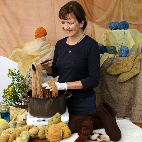 Mojstrica rokodelka Ladka Peneš pri barvanju uporablja materiale iz lokalnega okolja, delovni postopki pa temeljijo na starih, tradicionalnih znanjih.