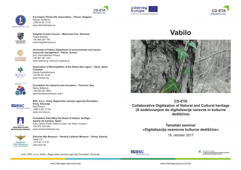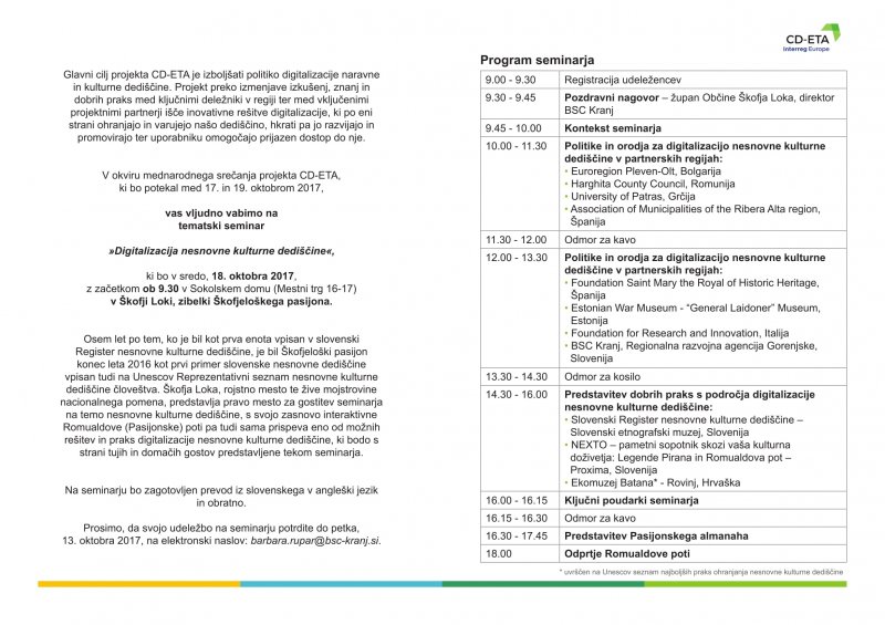 V okviru mednarodnega srečanja projekta CD-ETA (Interreg Europe) vas vljudno vabimo na tematski seminar »Digitalizacija nesnovne kulturne dediščine«, ki bo v sredo, 18. oktobra 2017, z začetkom ob 9.30 v Sokolskem domu (Mestni trg 16-17) v Škofji Loki, zibelki Škofjeloškega pasijona.