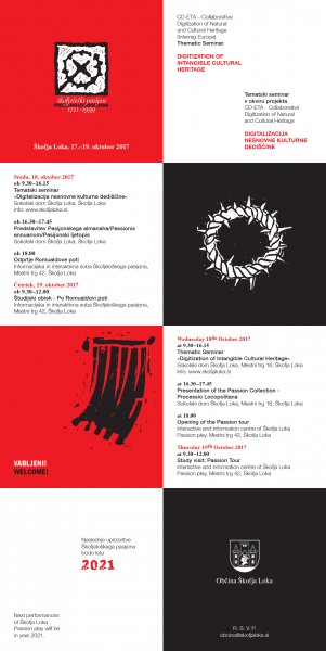 Osem let po tem, ko je bil kot prva enota vpisan v slovenski Register nesnovne kulturne dediščine, je bil Škofjeloški pasijon konec leta 2016 kot prvi primer slovenske nesnovne dediščine vpisan tudi na Unescov Reprezentativni seznam nesnovne kulturne dediščine človeštva. Škofja Loka, rojstno mesto te žive mojstrovine nacionalnega pomena, predstavlja pravo mesto za gostitev seminarja na temo nesnovne kulturne dediščine, s svojo zasnovo interaktivne Romualdove (Pasijonske) poti pa tudi sama prispeva eno od možnih rešitev in praks digitalizacije nesnovne kulturne dediščine, ki bodo s strani tujih in domačih gostov predstavljene tekom seminarja.