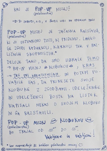 Postavili bomo tudi POP-UP MUZEJ KLOBUKOV. Gre za priložnostni muzej, ki ga ustvarijo prisotni. Vsak bo na svoj klobuk zapisal njegovo zgodbo in ga priložnostno razstavil. Vabljeni, da se nam pridružite v tem (za nas) nenavadnem muzeju!