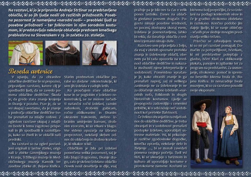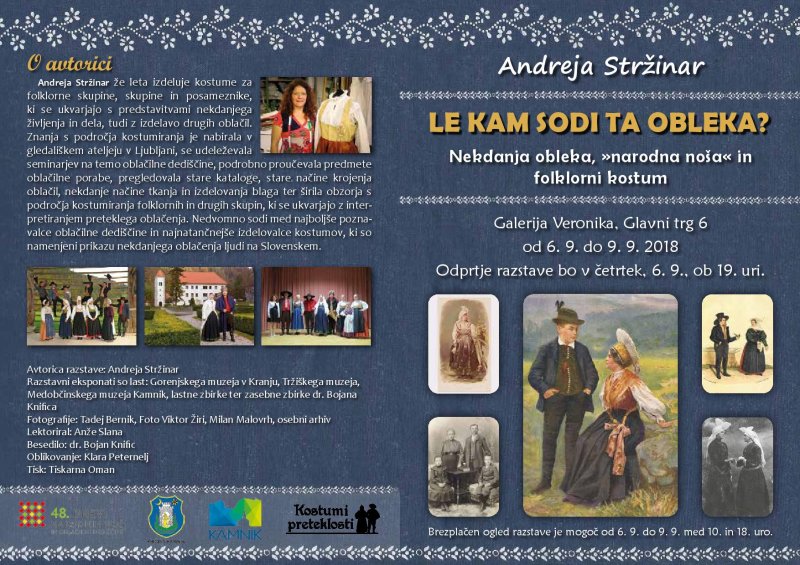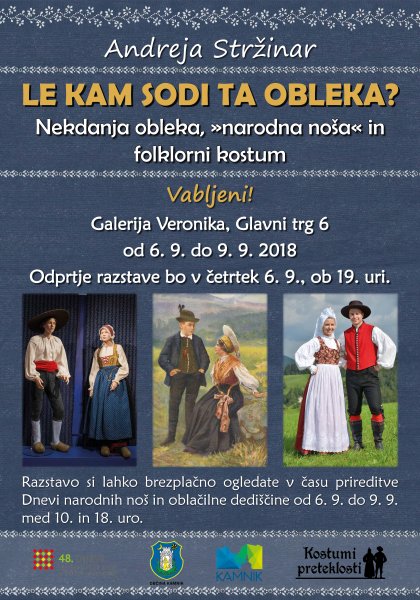 Razstava "Le kam sodi ta obleka? Nekdanja obleka, "narodna noša", folklorni kostumi" je na ogled v Galeriji Veronika (Glavni trg 6 v Kamniku).